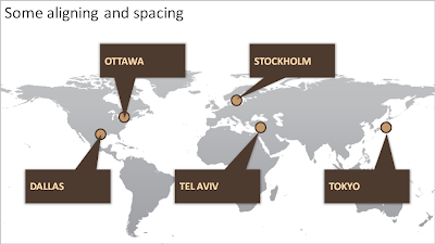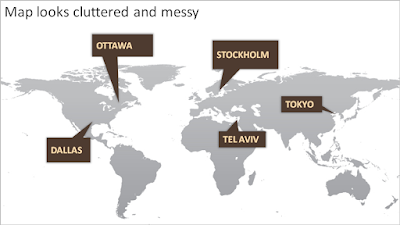 One of my clients is keen to show its new network of global support offices. Maps can look messy and random. Here are some simple things you can do to put things in order. We can not change the location of the planet's cities, we have control over PowerPoint shapes...