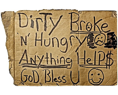Weekend reading. A site with signs and portraits of homeless people. It makes you think. You got a piece of card board and a marker (in fact that's all you got), now write the best "pitch" slide you can...