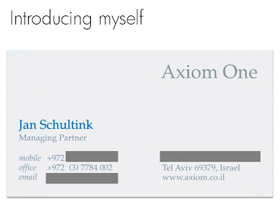 Right at the start of a presentation I always create an opportunity for the speaker to introduce herself. What visual to use for this? Definitely not a boring bullet point summary of your CV. Put a personal image that describes something unique about yourself. It can be frivolous in an informal setting, and in more formal presentations, a scan of your business card ("so last century") can be a good background.