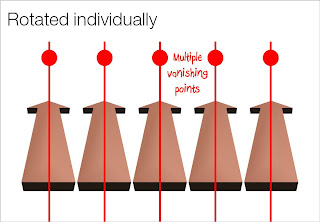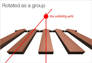 Here is an important thing to remember when using 3D rotations in PowerPoint: rotate a composition of objects as a group, rather than a collection of individual objects. Grouping them preserves one vanishing point in your slide composition. An example: