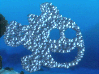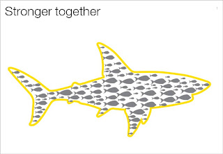 Some might consider it a cliché, but I found it still useful: the school of fish swimming in formation to create the illusion of being a shark. For when you need to visualize how many smaller/weaker entities can work together to become very strong as a group.