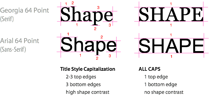 A very interesting analysis of why it is harder to read all caps text on UXMovement. All caps reduces the number of differentiators between words, and hence should only be used in short bites such as titles, logos or lables. I have been ranting about title caps as well before.