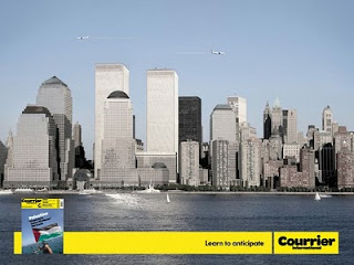 Our collective memory has some very powerful images. Photo editing software enables us to manipulate them and use them to communicate a message. "Learn to anticipate" says the ad below with a set of shortened WTC towers and planes happily flying over it. Maybe the ad was meant to be funny. Maybe its intention was to shock people and trigger a discussion of a controversial subject (What Benetton tried to do in the 1990s). A "fail" on both accounts. Be careful with charged visual concepts.