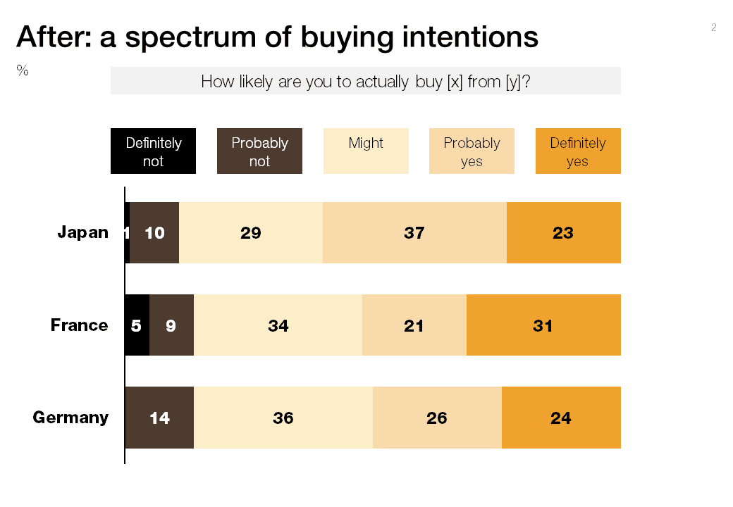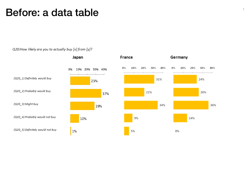 Both of these charts contain the exact same data. The second is a lot easier to read, the spectrum of customer choices is neatly laid out, and the colors are picked in sequential order.