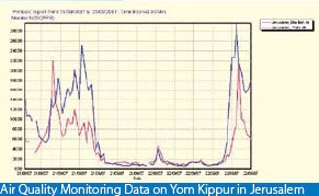 Everything comes to a complete stand still. No cars, no shopping, no noise, no polluting smells (see graph below, air pollution drops by a factor 100), no nothing. I live right on the sea shore just north of Tel Aviv, very close to the busiest highway crossing of Israel. It is magical to see human society grind to a halt, and you can almost feel the energy of a few million people near by reflecting on what contributions they have made over the past year.  The sun setting and the only sounds remaining are those of the sea, the wind, and the birds. This is not your average car-free day, it is really about letting nature taking back over.