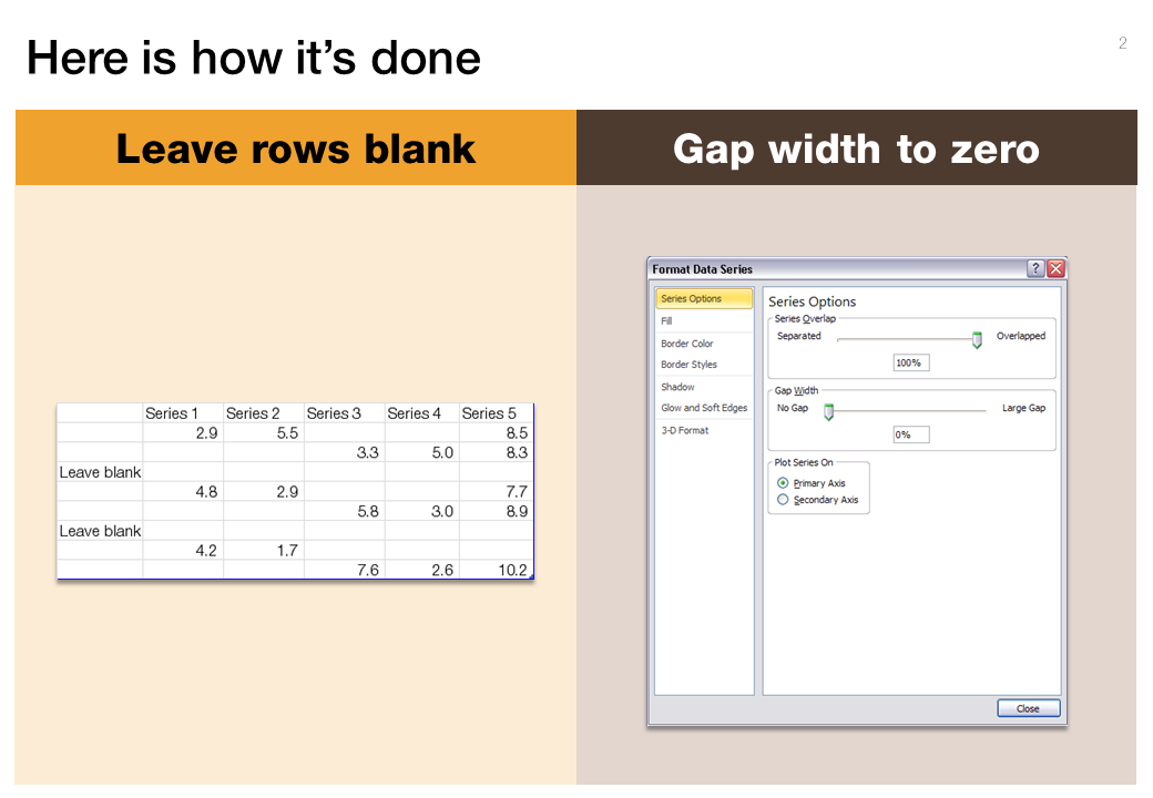 2. Adjust the data points manually. The first stacked column goes in regularly. The second stacked column (that should have a different color scheme) gets added on top of the first one. But for data points of the second column, you zero out the values of the first one. Sounds a bit complicated, but the visual example below should make it clear.