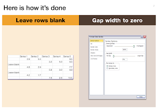1. Set the gap width to zero (in the format data series menu) to create the white breaks in between the columns