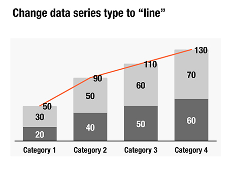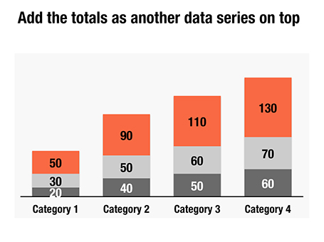 Here is a little trick to create automatic totals on top of column charts. This is an alternative to placing text labels manually, and especially useful when the data in the column charts is changing frequently.